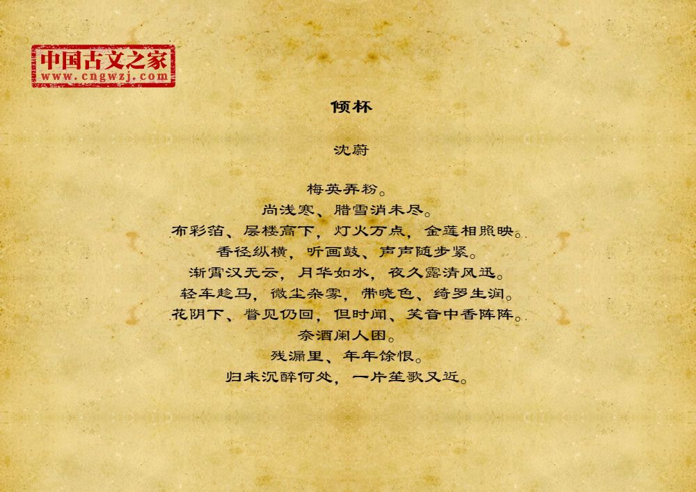 梅英弄粉。尚浅寒、腊雪消未尽。布彩箔、层楼高下,灯火万点,金莲相照映。香径纵横,听画鼓、声声随步紧。渐霄汉无云,月华如水,夜久露清风迅。轻车趁马,微尘杂雾,带晓色、绮罗生润。花阴下、瞥见仍回,但时闻、笑音中香阵阵。奈酒阑人困。残漏里、年年馀恨。归来沉醉何处,一片笙歌又近。
