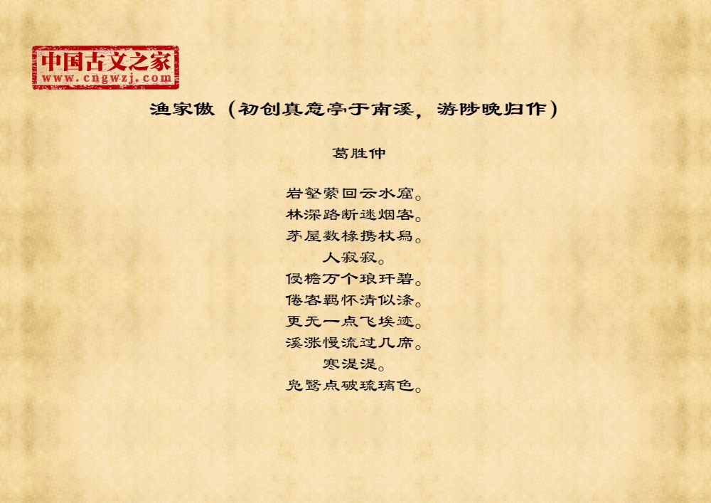 《渔家傲(初创真意亭于南溪,游陟晚归作)》的原文打印版(葛胜仲)