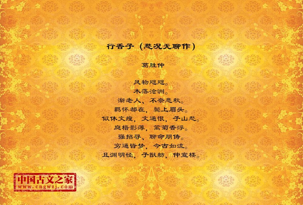 风物飕飕。木落沧洲。渐老人、不奈悲秋。羁怀都在,鬓上眉头。似休文瘦,文通恨,子山愁。庭梧影薄,篱菊香浮。强招寻、聊命朋俦。穷通皆梦,今古如流。且渊明径,子猷舫,仲宣楼。
