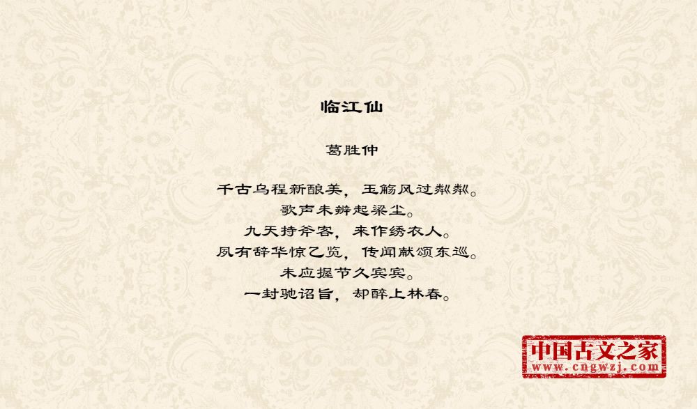 葛胜仲(1072~1144)宋代词人,字鲁卿,丹阳(今属江苏)人。绍圣四年(1097)进士。元符三年(1100),中宏词科。累迁国子司业,官至文华阁待