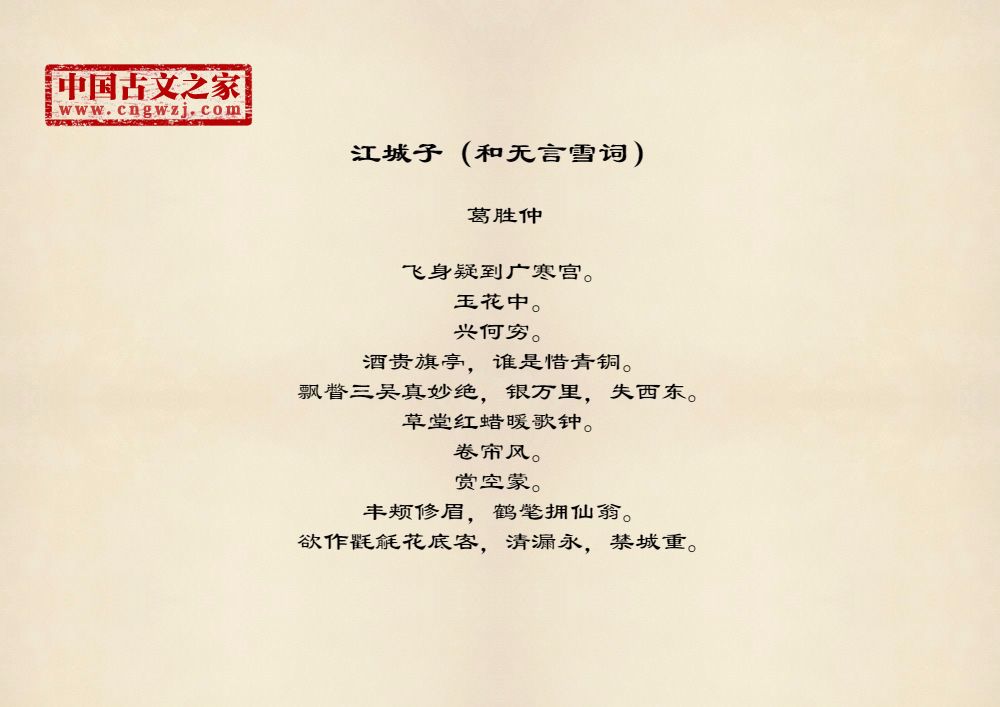葛胜仲(1072~1144)宋代词人,字鲁卿,丹阳(今属江苏)人。绍圣四年(1097)进士。元符三年(1100),中宏词科。累迁国子司业,官至文华阁待
