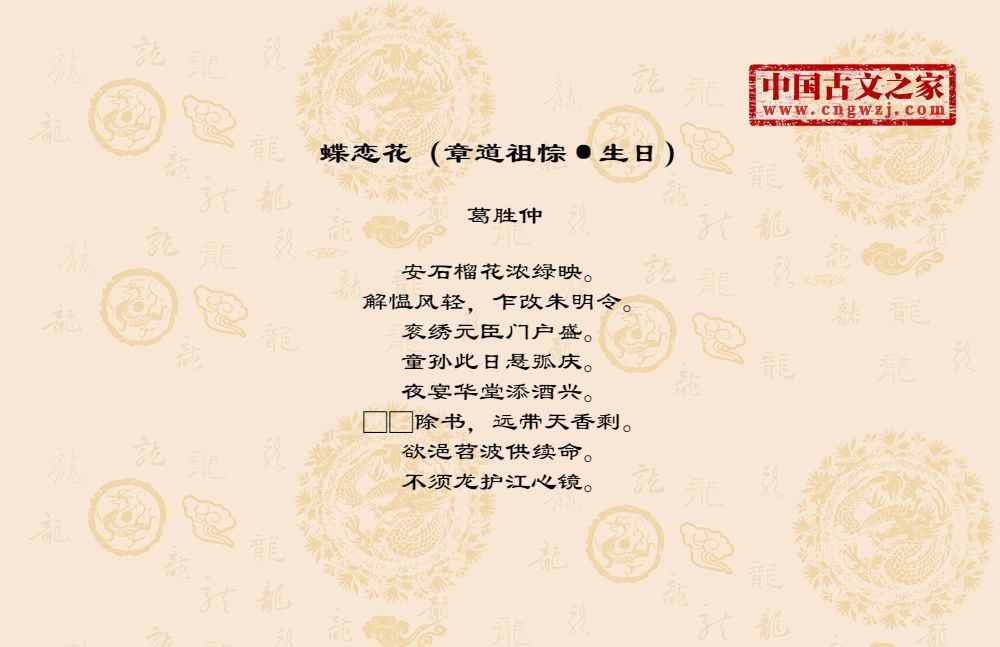 《蝶恋花(章道祖悰·生日)》的原文打印版(葛胜仲)