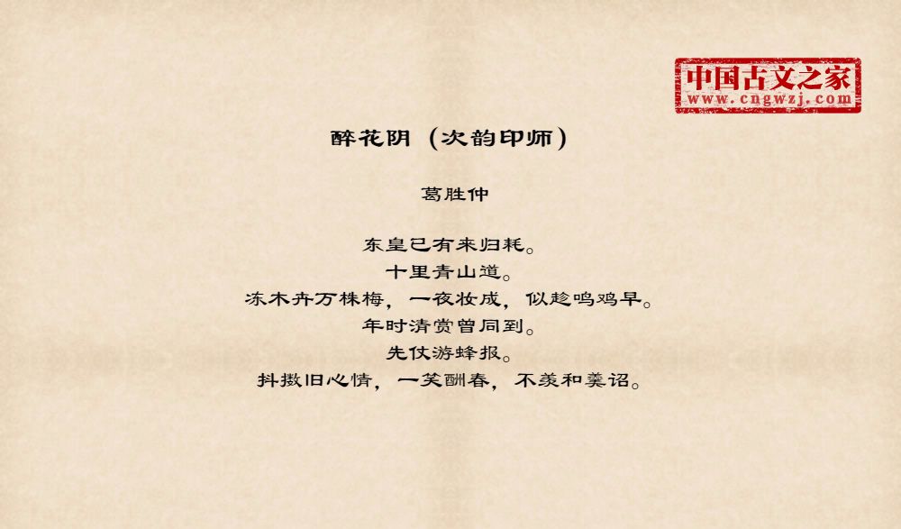 东皇已有来归耗。十里青山道。冻木卉万株梅,一夜妆成,似趁鸣鸡早。年时清赏曾同到。先仗游蜂报。抖擞旧心情,一笑酬春,不羡和羹诏。