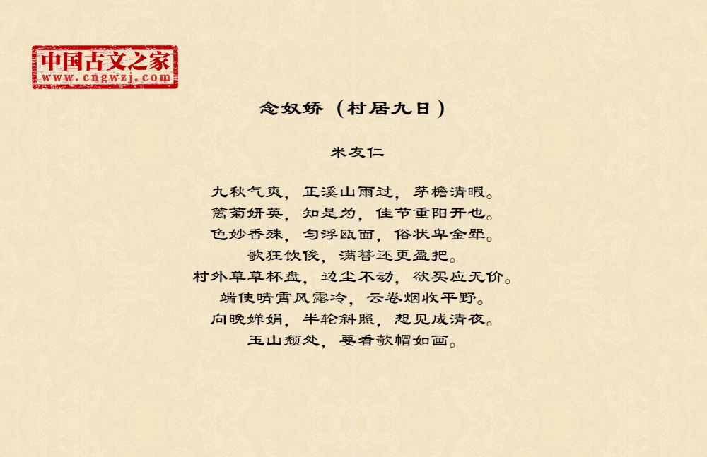 九秋气爽,正溪山雨过,茅檐清暇。篱菊妍英,知是为,佳节重阳开也。色妙香殊,匀浮瓯面,俗状卑金斝。歌狂饮俊,满簪还更盈把。村外草草杯盘,边尘不动,欲买应无价。端使晴霄风露冷,云卷烟收平野。向晚婵娟,半轮斜照,想见成清夜。玉山颓处,要看欹帽如画。