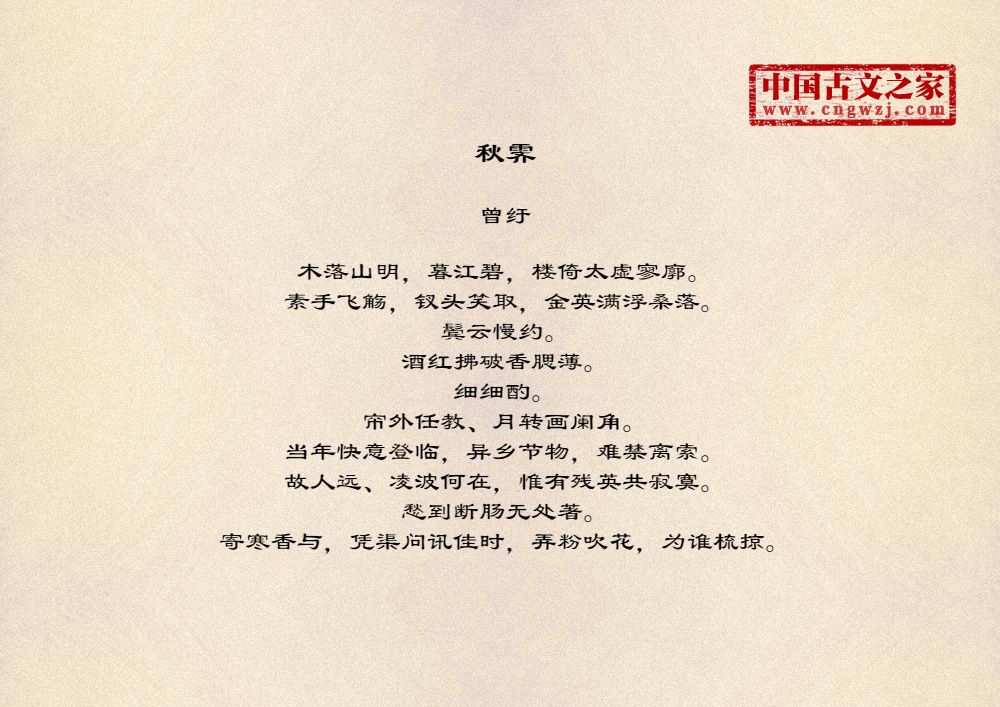 木落山明,暮江碧,楼倚太虚寥廓。素手飞觞,钗头笑取,金英满浮桑落。鬓云慢约。酒红拂破香腮薄。细细酌。帘外任教、月转画阑角。当年快意登临,异乡节物,难禁离索。故人远、凌波何在,惟有残英共寂寞。愁到断肠无处著。寄寒香与,凭渠问讯佳时,弄粉吹花,为谁梳掠。