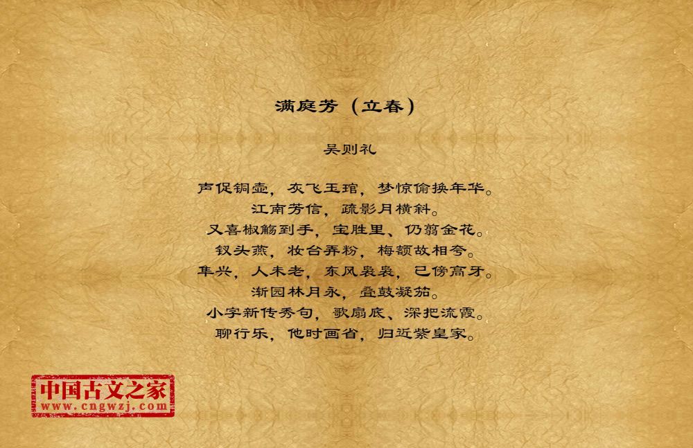 声促铜壶,灰飞玉琯,梦惊偷换年华。江南芳信,疏影月横斜。又喜椒觞到手,宝胜里、仍翦金花。钗头燕,妆台弄粉,梅额故相夸。隼兴,人未老,东风袅袅,已傍高牙。渐园林月永,叠鼓凝笳。小字新传秀句,歌扇底、深把流霞。聊行乐,他时画省,归近紫皇家。