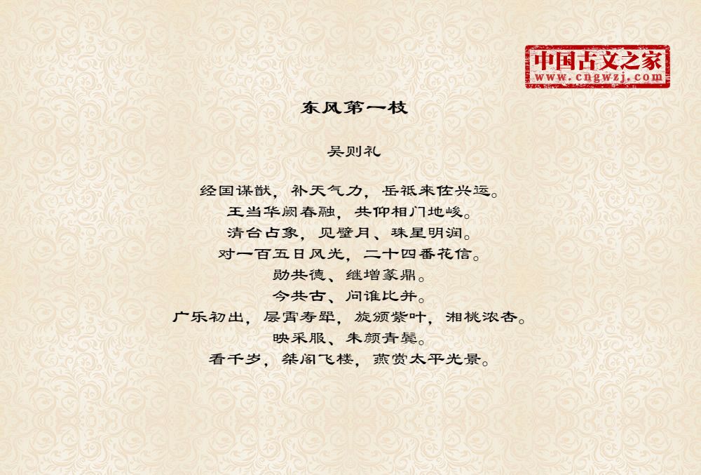 经国谋猷,补天气力,岳祗来佐兴运。王当华阙春融,共仰相门地峻。清台占象,见壁月、珠星明润。对一百五日风光,二十四番花信。勋共德、继增篆鼎。今共古、问谁比并。广乐初出,层霄寿斝,旋颁紫叶,湘桃浓杏。映采服、朱颜青鬓。看千岁,桀阁飞楼,燕赏太平光景。
