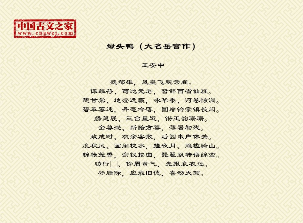 王安中(1075~1134)北宋末、南宋初词人。字履道,号初寮。中山阳曲(今山西太原)人。年青时曾从师苏轼、晁说之。晁教以为学当谨初,故牓其室为初寮。