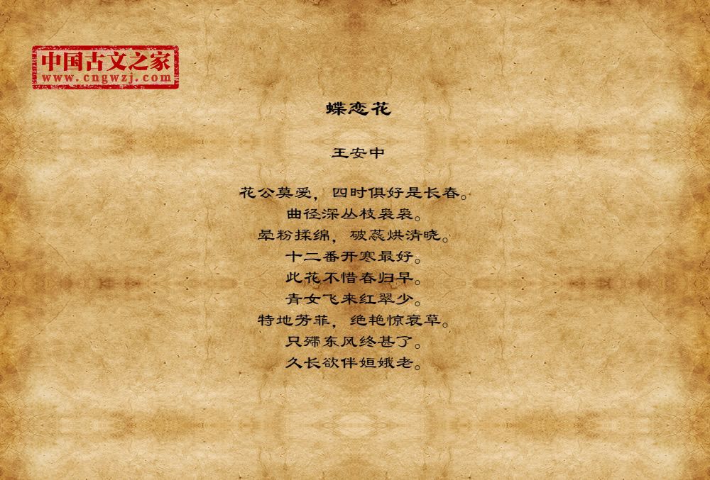花公莫爱,四时俱好是长春。曲径深丛枝袅袅。晕粉揉绵,破蕊烘清晓。十二番开寒最好。此花不惜春归早。青女飞来红翠少。特地芳菲,绝艳惊衰草。只殢东风终甚了。久长欲伴姮娥老。