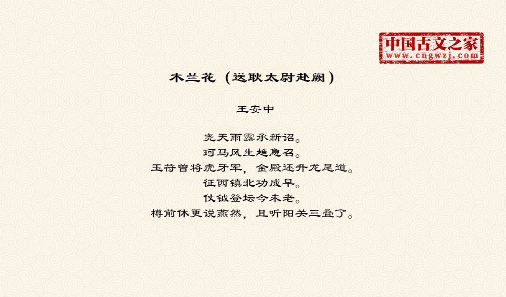 尧天雨露承新诏。珂马风生趋急召。玉符曾将虎牙军,金殿还升龙尾道。征西镇北功成早。仗钺登坛今未老。樽前休更说燕然,且听阳关三叠了。