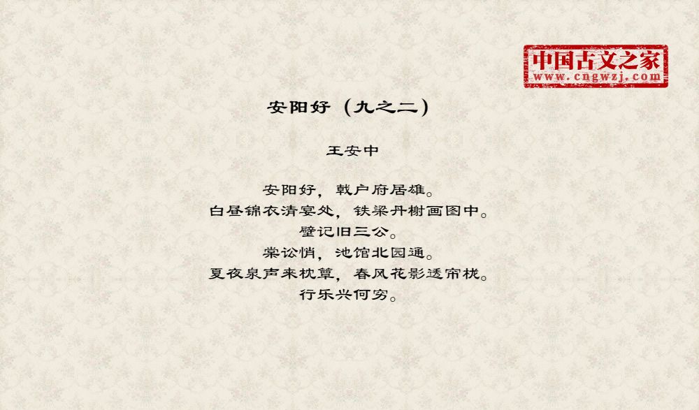 安阳好,戟户府居雄。白昼锦衣清宴处,铁梁丹榭画图中。壁记旧三公。棠讼悄,池馆北园通。夏夜泉声来枕簟,春风花影透帘栊。行乐兴何穷。