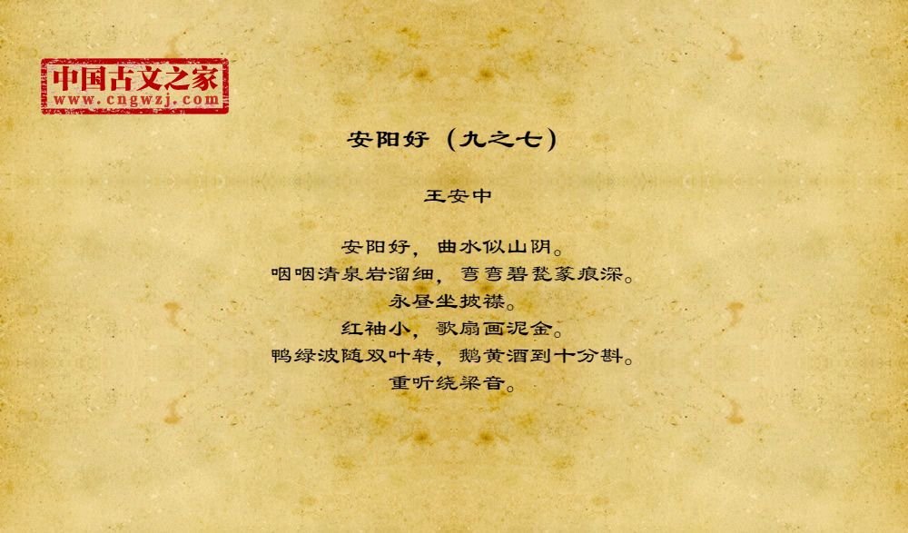 安阳好,曲水似山阴。咽咽清泉岩溜细,弯弯碧甃篆痕深。永昼坐披襟。红袖小,歌扇画泥金。鸭绿波随双叶转,鹅黄酒到十分斟。重听绕梁音。