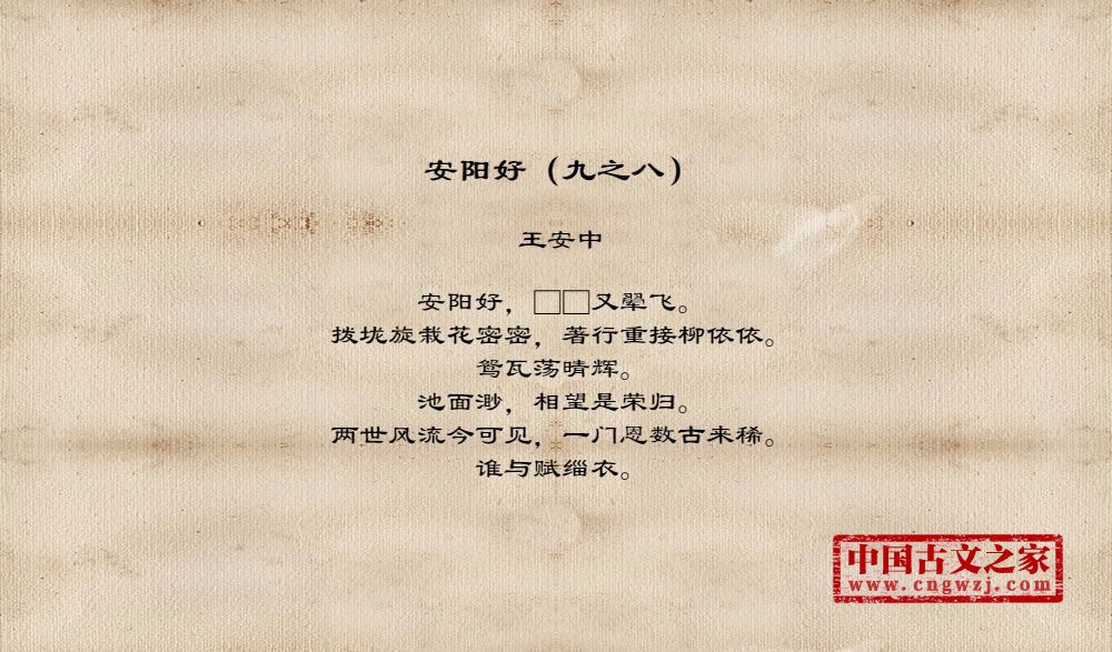 安阳好,□□又翚飞。拨垅旋栽花密密,著行重接柳依依。鸳瓦荡晴辉。池面渺,相望是荣归。两世风流今可见,一门恩数古来稀。谁与赋缁衣。