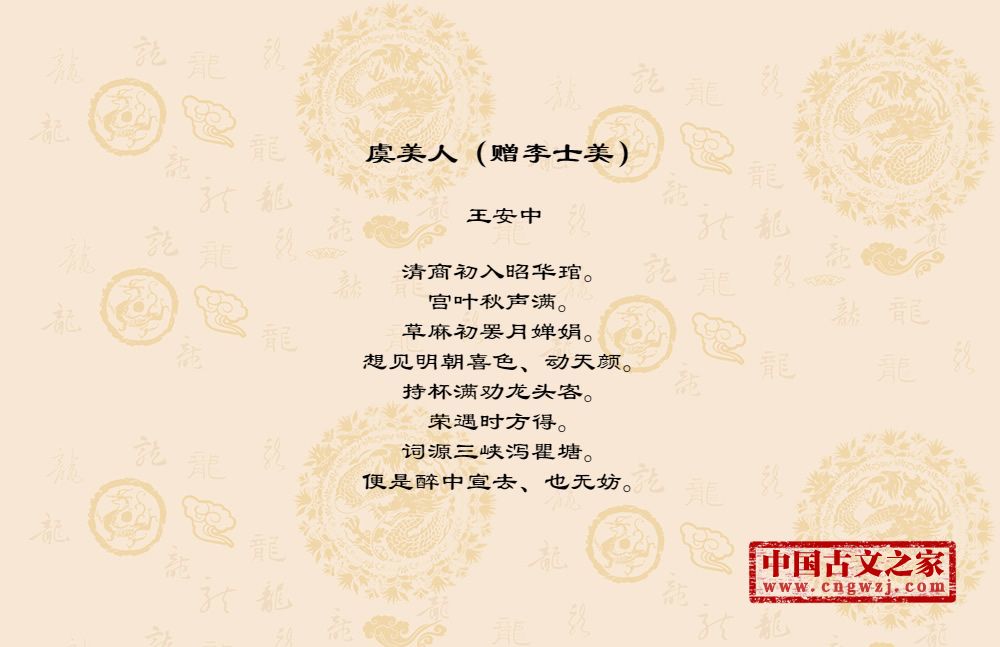 王安中(1075~1134)北宋末、南宋初词人。字履道,号初寮。中山阳曲(今山西太原)人。年青时曾从师苏轼、晁说之。晁教以为学当谨初,故牓其室为初寮。