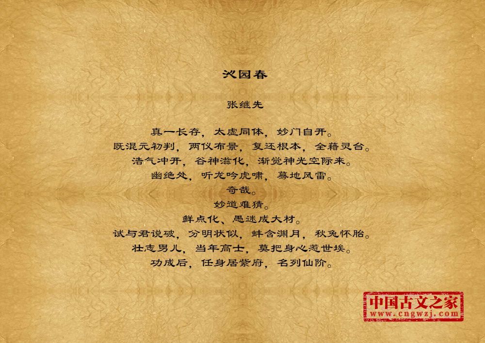 真一长存,太虚同体,妙门自开。既混元初判,两仪布景,复还根本,全藉灵台。浩气冲开,谷神滋化,渐觉神光空际来。幽绝处,听龙吟虎啸,蓦地风雷。奇哉。妙道难猜。鲜点化、愚迷成大材。试与君说破,分明状似,蚌含渊月,秋兔怀胎。壮志男儿,当年高士,莫把身心惹世埃。功成后,任身居紫府,名列仙阶。