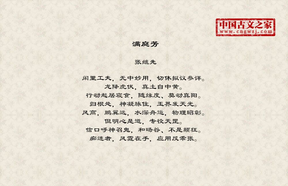 闲里工夫,无中妙用,切休拟议参详。龙降虎伏,真土自中黄。行动起居寝食,随缘度、莫动真阳。归根处,神凝脉住,玉界发天光。风高,鹏翼远,水深舟运,物理昭彰。但明心是道,专役天罡。信口呼神召鬼,和旸谷、不是颠狂。痴迷者,风霆在手,应用反乖张。