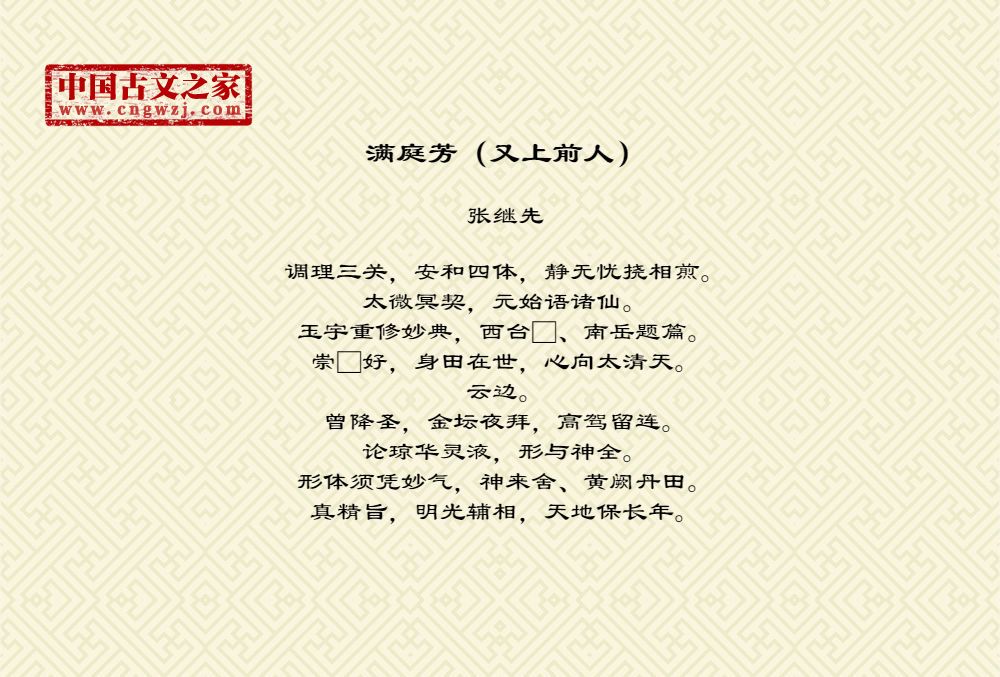 调理三关,安和四体,静无忧挠相煎。太微冥契,元始语诸仙。玉宇重修妙典,西台□、南岳题篇。崇□好,身田在世,心向太清天。云边。曾降圣,金坛夜拜,高驾留连。论琼华灵液,形与神全。形体须凭妙气,神来舍、黄阙丹田。真精旨,明光辅相,天地保长年。