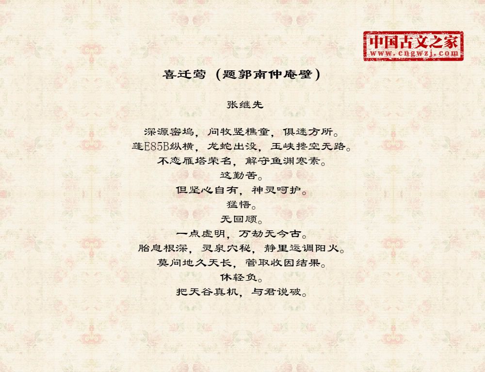 深源密坞,问牧竖樵童,俱迷方所。蓬E85B纵横,龙蛇出没,玉峡搀空无路。不恋雁塔荣名,解守鱼渊寒素。这勤苦。但坚心自有,神灵呵护。猛悟。无回顾。一点虚明,万劫无今古。胎息根深,灵泉穴秘,静里运调阳火。莫问地久天长,管取收因结果。休轻负。把天谷真机,与君说破。