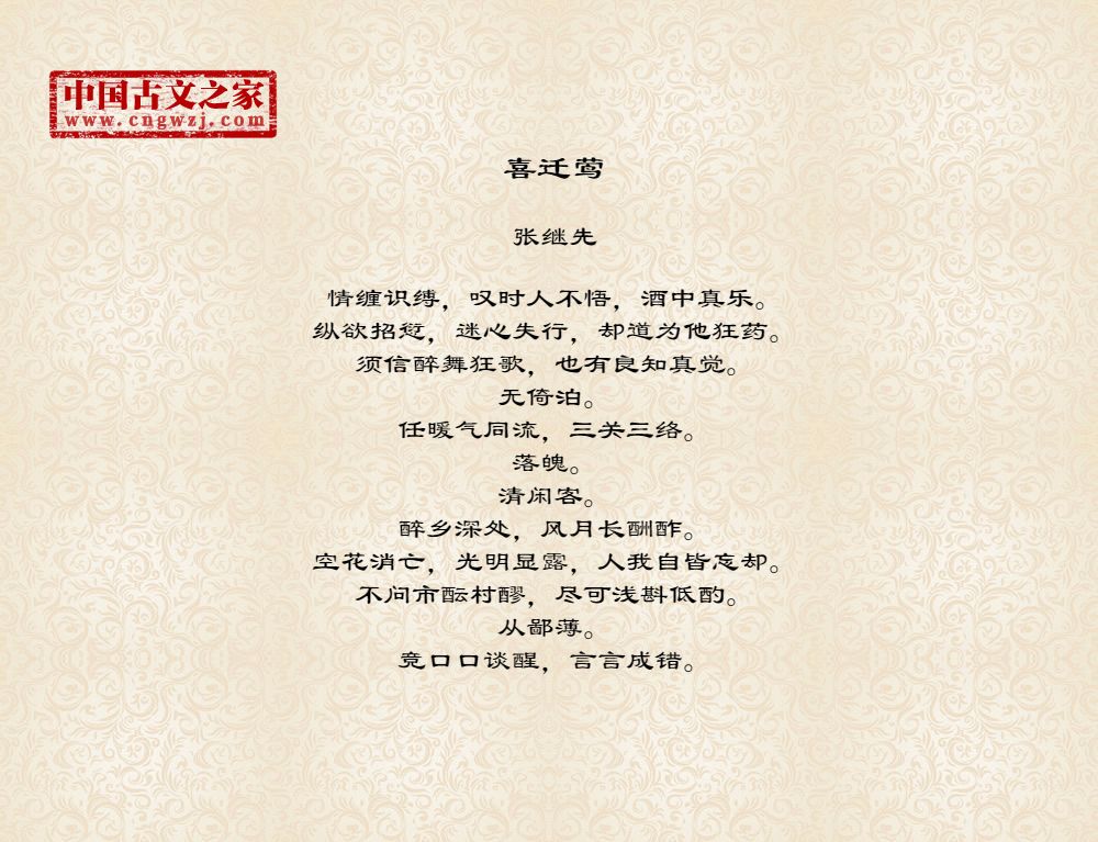 情缠识缚,叹时人不悟,酒中真乐。纵欲招愆,迷心失行,却道为他狂药。须信醉舞狂歌,也有良知真觉。无倚泊。任暖气同流,三关三络。落魄。清闲客。醉乡深处,风月长酬酢。空花消亡,光明显露,人我自皆忘却。不问市酝村醪,尽可浅斟低酌。从鄙薄。竞口口谈醒,言言成错。