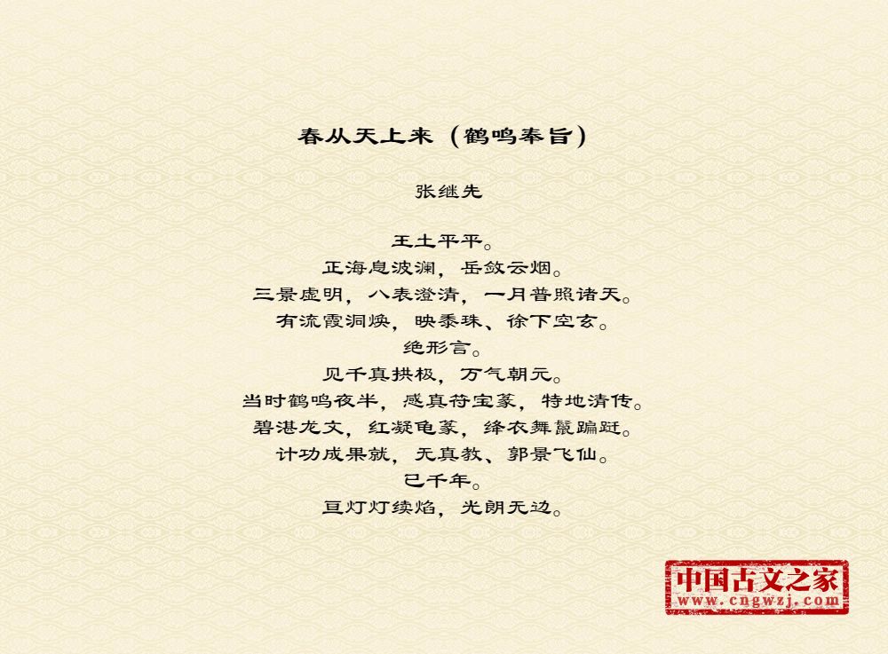 王土平平。正海息波澜,岳敛云烟。三景虚明,八表澄清,一月普照诸天。有流霞洞焕,映黍珠、徐下空玄。绝形言。见千真拱极,万气朝元。当时鹤鸣夜半,感真符宝篆,特地清传。碧湛龙文,红凝龟篆,绛衣舞鬣蹁跹。计功成果就,无真教、郭景飞仙。已千年。亘灯灯续焰,光朗无边。