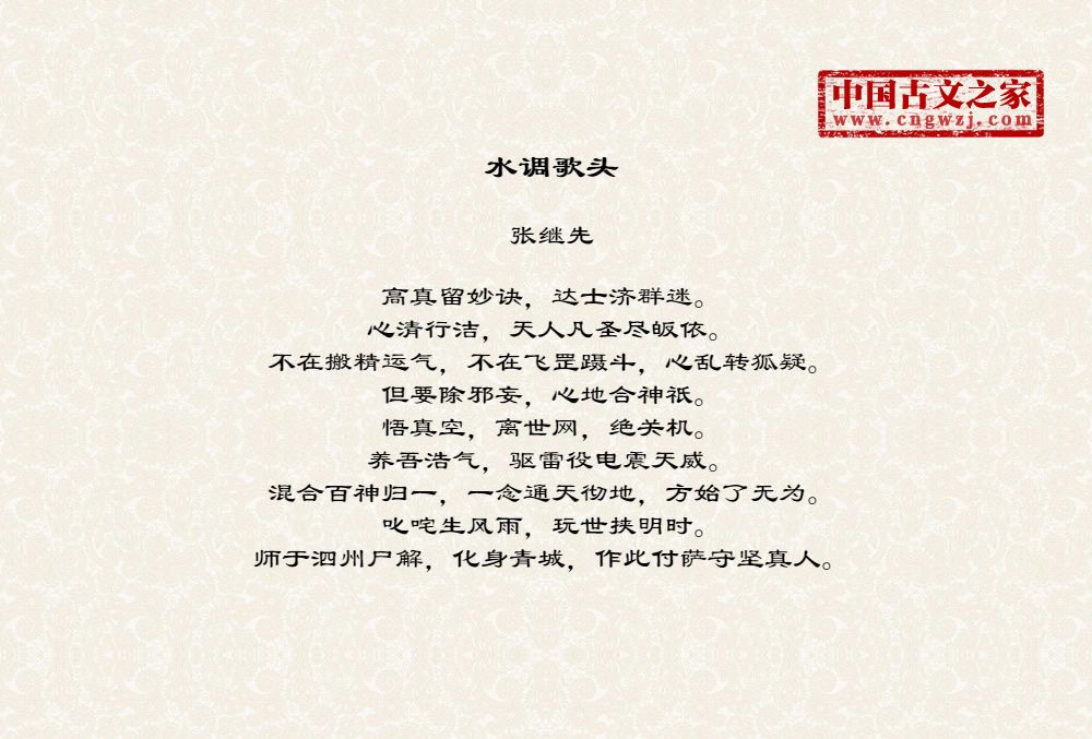 高真留妙诀,达士济群迷。心清行洁,天人凡圣尽皈依。不在搬精运气,不在飞罡蹑斗,心乱转狐疑。但要除邪妄,心地合神祇。悟真空,离世网,绝关机。养吾浩气,驱雷役电震天威。混合百神归一,一念通天彻地,方始了无为。叱咤生风雨,玩世挟明时。师于泗州尸解,化身青城,作此付萨守坚真人。