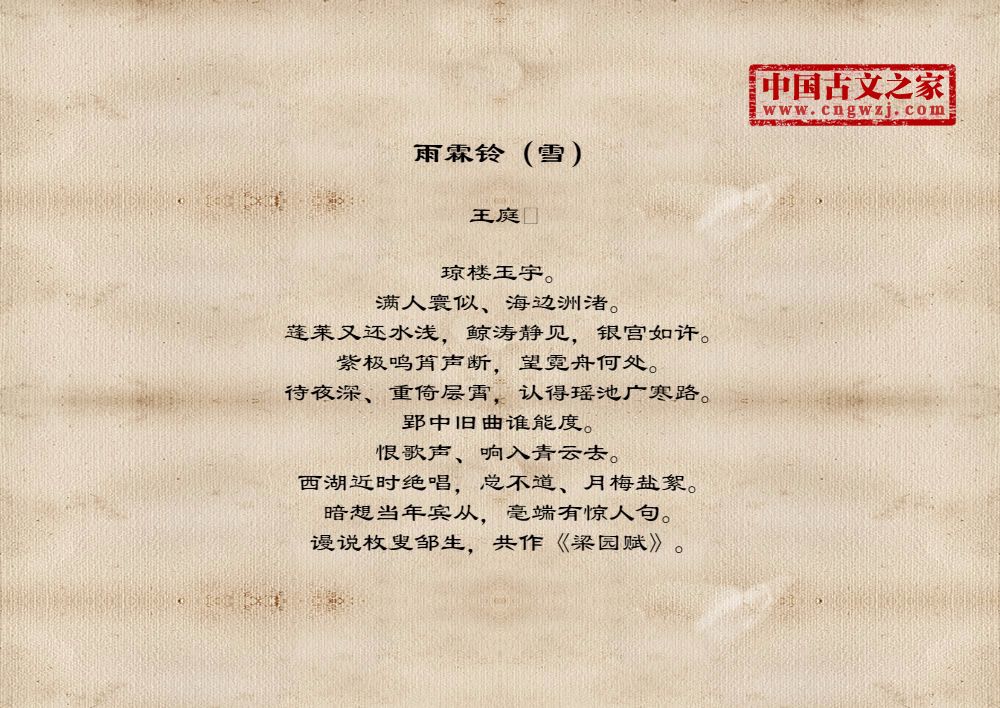 琼楼玉宇。满人寰似、海边洲渚。蓬莱又还水浅,鲸涛静见,银宫如许。紫极鸣筲声断,望霓舟何处。待夜深、重倚层霄,认得瑶池广寒路。郢中旧曲谁能度。恨歌声、响入青云去。西湖近时绝唱,总不道、月梅盐絮。暗想当年宾从,毫端有惊人句。谩说枚叟邹生,共作《梁园赋》。