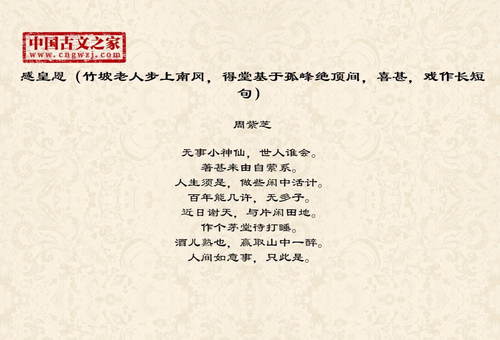 《感皇恩(竹坡老人步上南冈,得堂基于孤峰绝顶间,喜甚,戏作长短句)》由周紫芝创作