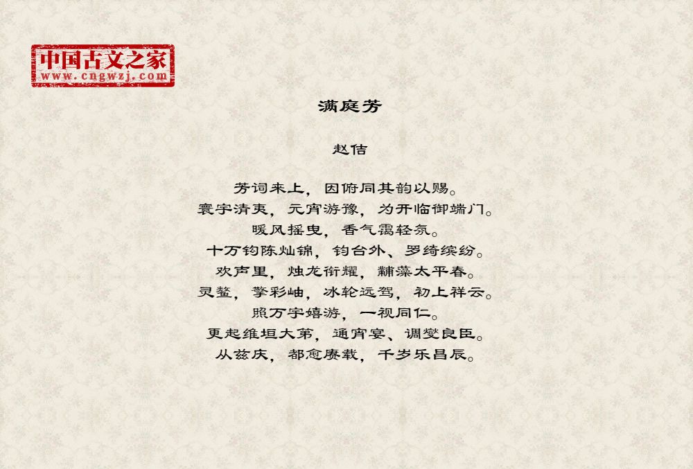 芳词来上,因俯同其韵以赐。寰宇清夷,元宵游豫,为开临御端门。暖风摇曳,香气霭轻氛。十万钩陈灿锦,钧台外、罗绮缤纷。欢声里,烛龙衔耀,黼藻太平春。灵鳌,擎彩岫,冰轮远驾,初上祥云。照万宇嬉游,一视同仁。更起维垣大第,通宵宴、调燮良臣。从兹庆,都愈赓载,千岁乐昌辰。