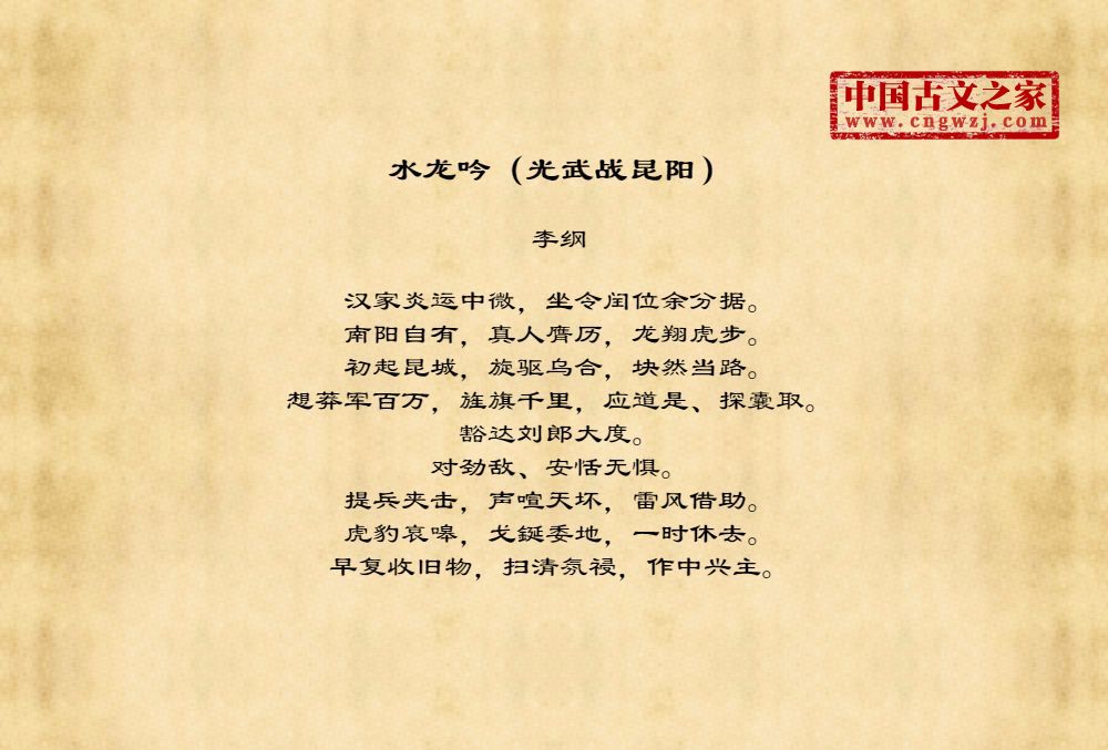 汉家炎运中微,坐令闰位余分据。南阳自有,真人膺历,龙翔虎步。初起昆城,旋驱乌合,块然当路。想莽军百万,旌旗千里,应道是、探囊取。豁达刘郎大度。对劲敌、安恬无惧。提兵夹击,声喧天坏,雷风借助。虎豹哀嗥,戈鋋委地,一时休去。早复收旧物,扫清氛祲,作中兴主。
