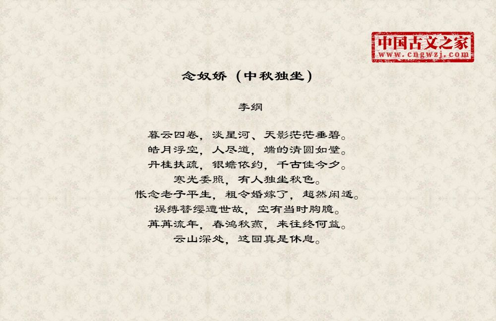 暮云四卷,淡星河、天影茫茫垂碧。皓月浮空,人尽道,端的清圆如璧。丹桂扶疏,银蟾依约,千古佳今夕。寒光委照,有人独坐秋色。怅念老子平生,粗令婚嫁了,超然闲适。误缚簪缨遭世故,空有当时胸臆。苒苒流年,春鸿秋燕,来往终何益。云山深处,这回真是休息。