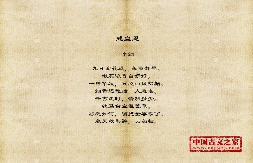 九日菊花迟,茱萸却早。嫩蕊浓香自妍好。一簪华发,只恐西风吹帽。细看还遍插,人忘老。千古此时,清欢多少。铁马台空但荒草。旅愁如海,须把金尊销了。暮天秋影碧,云如扫。