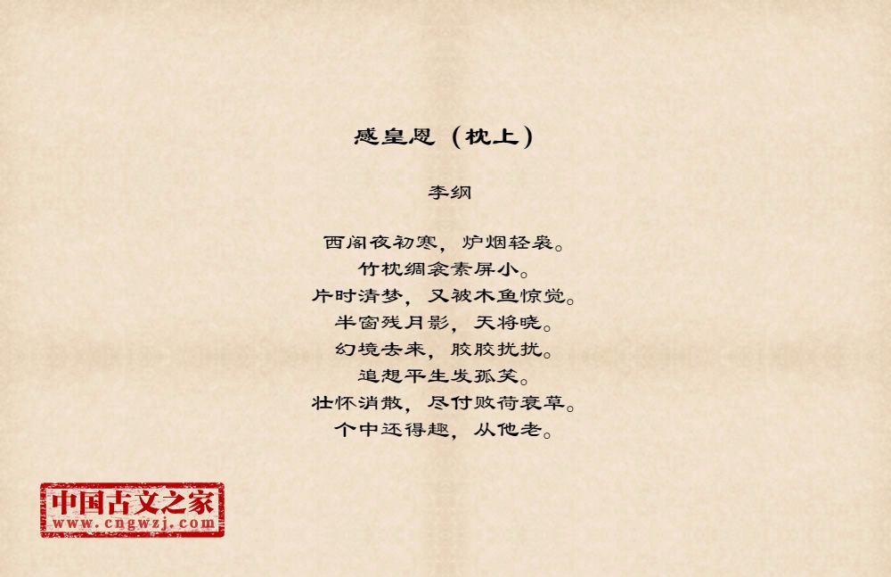 西阁夜初寒,炉烟轻袅。竹枕绸衾素屏小。片时清梦,又被木鱼惊觉。半窗残月影,天将晓。幻境去来,胶胶扰扰。追想平生发孤笑。壮怀消散,尽付败荷衰草。个中还得趣,从他老。