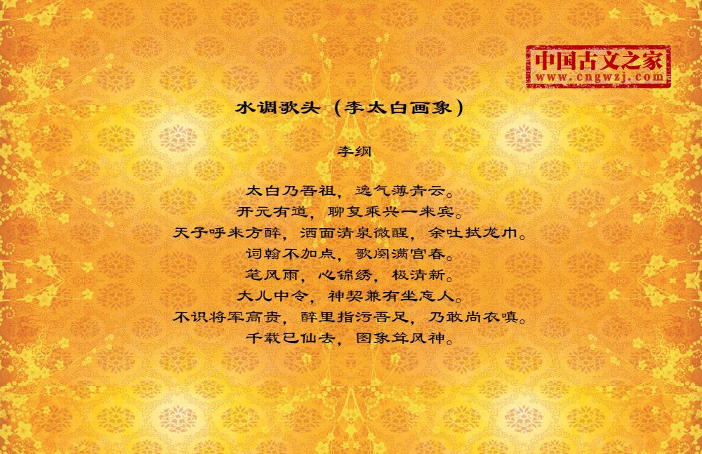 太白乃吾祖,逸气薄青云。开元有道,聊复乘兴一来宾。天子呼来方醉,洒面清泉微醒,余吐拭龙巾。词翰不加点,歌阕满宫春。笔风雨,心锦绣,极清新。大儿中令,神契兼有坐忘人。不识将军高贵,醉里指污吾足,乃敢尚衣嗔。千载已仙去,图象耸风神。