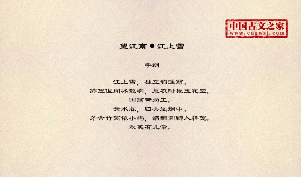 江上雪,独立钓渔翁。箬笠但闻冰散响,蓑衣时振玉花空。图画若为工。云水暮,归去远烟中。茅舍竹篱依小屿,缩鳊圆鲫入轻笼。欢笑有儿童。