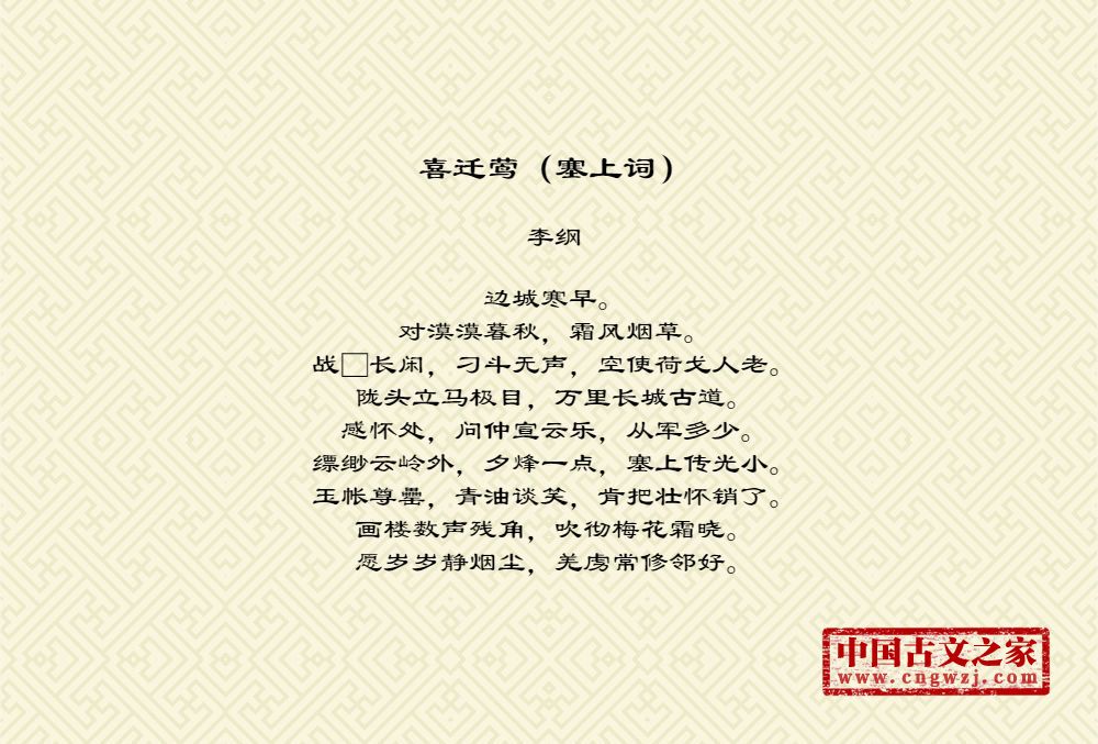 边城寒早。对漠漠暮秋,霜风烟草。战□长闲,刁斗无声,空使荷戈人老。陇头立马极目,万里长城古道。感怀处,问仲宣云乐,从军多少。缥缈云岭外,夕烽一点,塞上传光小。玉帐尊罍,青油谈笑,肯把壮怀销了。画楼数声残角,吹彻梅花霜晓。愿岁岁静烟尘,羌虏常修邻好。