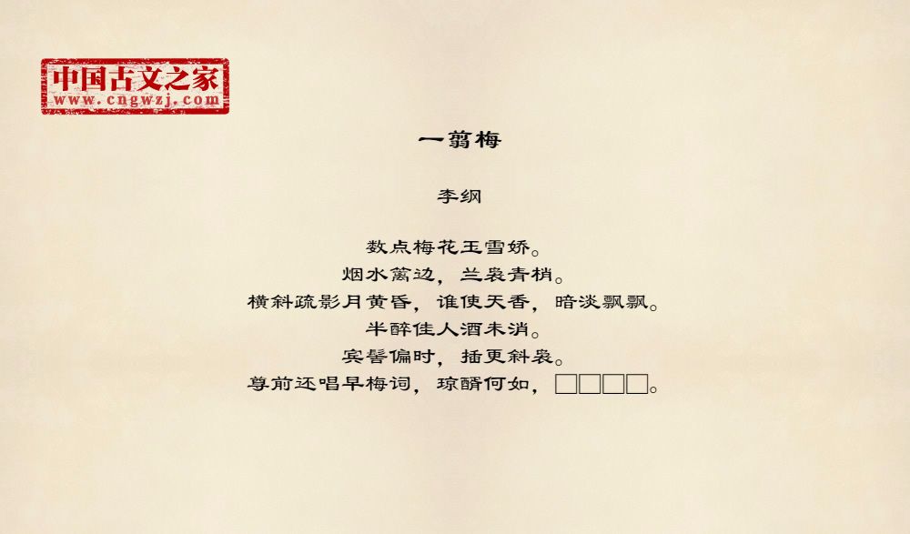 数点梅花玉雪娇。烟水篱边,兰袅青梢。横斜疏影月黄昏,谁使天香,暗淡飘飘。半醉佳人酒未消。宾髻偏时,插更斜袅。尊前还唱早梅词,琼醑何如,□□□□。