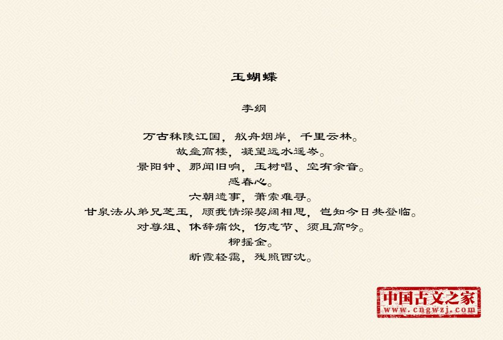 万古秣陵江国,舣舟烟岸,千里云林。故垒高楼,凝望远水遥岑。景阳钟、那闻旧响,玉树唱、空有余音。感春心。六朝遗事,萧索难寻。甘泉法从弟兄芝玉,顾我情深契阔相思,岂知今日共登临。对尊俎、休辞痛饮,伤志节、须且高吟。柳摇金。断霞轻霭,残照西沈。