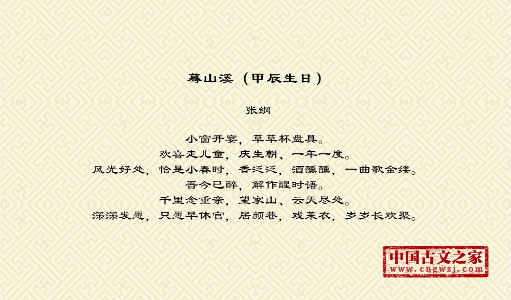 小窗开宴,草草杯盘具。欢喜走儿童,庆生朝、一年一度。风光好处,恰是小春时,香泛泛,酒醺醺,一曲歌金缕。吾今已醉,解作醒时语。千里念重亲,望家山、云天尽处。深深发愿,只愿早休官,居颜巷,戏莱衣,岁岁长欢聚。
