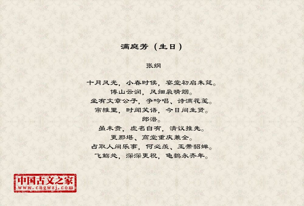 十月风光,小春时候,宴堂初启朱筵。博山云润,风细袅晴烟。坐有文章公子,争吟唱、诗满花笺。帘帷里,时闻笑语,今日间生贤。郎潜。虽未贵,虚名自有,清议推先。更那堪、高堂重庆兼全。占取人间乐事,何必羡、玉带貂蝉。飞觞处,深深更祝,龟鹤永齐年。