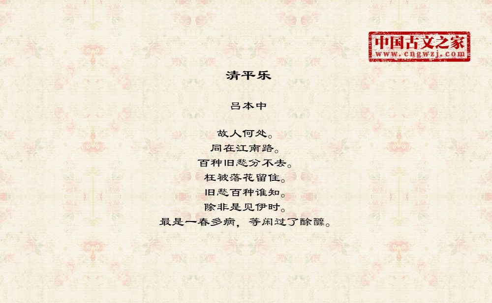 故人何处。同在江南路。百种旧愁分不去。枉被落花留住。旧愁百种谁知。除非是见伊时。最是一春多病,等闲过了酴醿。