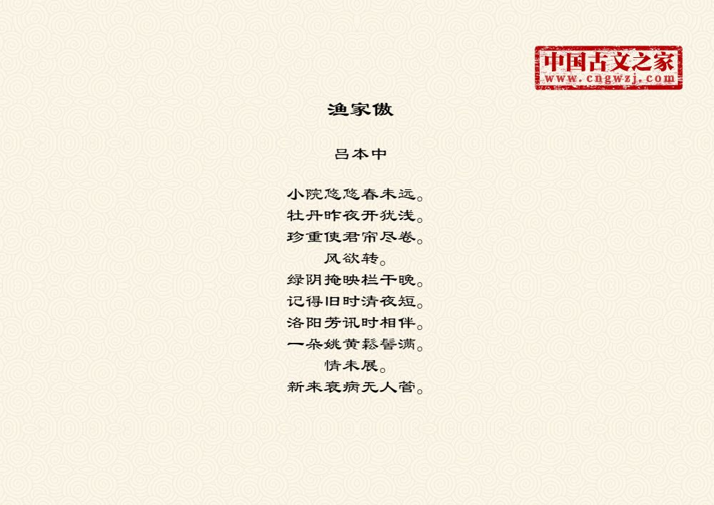 小院悠悠春未远。牡丹昨夜开犹浅。珍重使君帘尽卷。风欲转。绿阴掩映栏干晚。记得旧时清夜短。洛阳芳讯时相伴。一朵姚黄鬆髻满。情未展。新来衰病无人管。