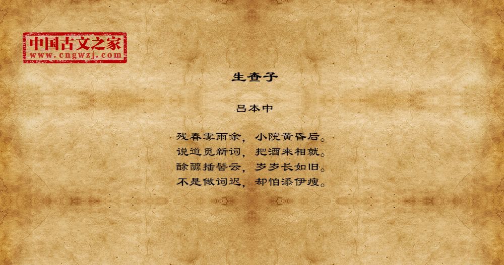 残春雾雨余,小院黄昏后。说道觅新词,把酒来相就。酴醿插髻云,岁岁长如旧。不是做词迟,却怕添伊瘦。