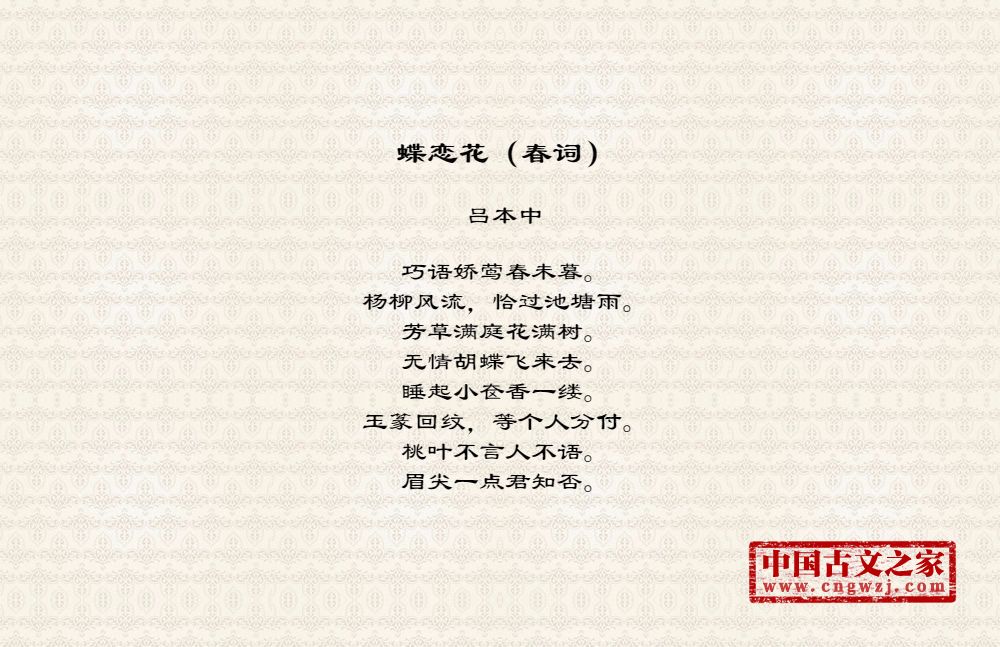 巧语娇莺春未暮。杨柳风流,恰过池塘雨。芳草满庭花满树。无情胡蝶飞来去。睡起小奁香一缕。玉篆回纹,等个人分付。桃叶不言人不语。眉尖一点君知否。