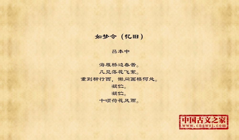 海雁桥边春苦。几见落花飞絮。重到柳行西,懒问画楼何处。凝伫。凝伫。十顷荷花风雨。