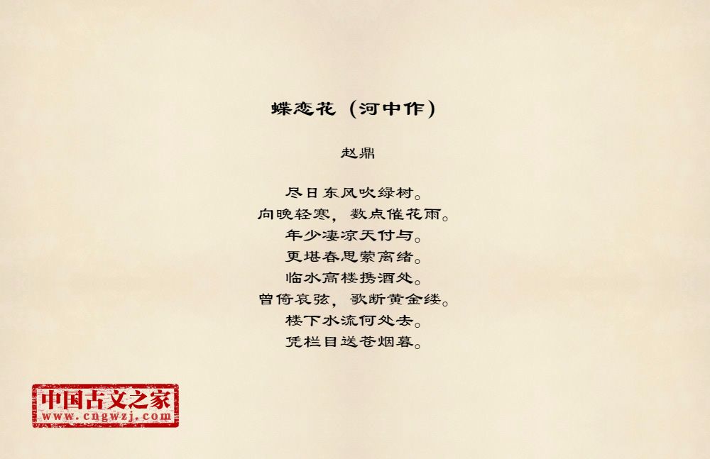 尽日东风吹绿树。向晚轻寒,数点催花雨。年少凄凉天付与。更堪春思萦离绪。临水高楼携酒处。曾倚哀弦,歌断黄金缕。楼下水流何处去。凭栏目送苍烟暮。