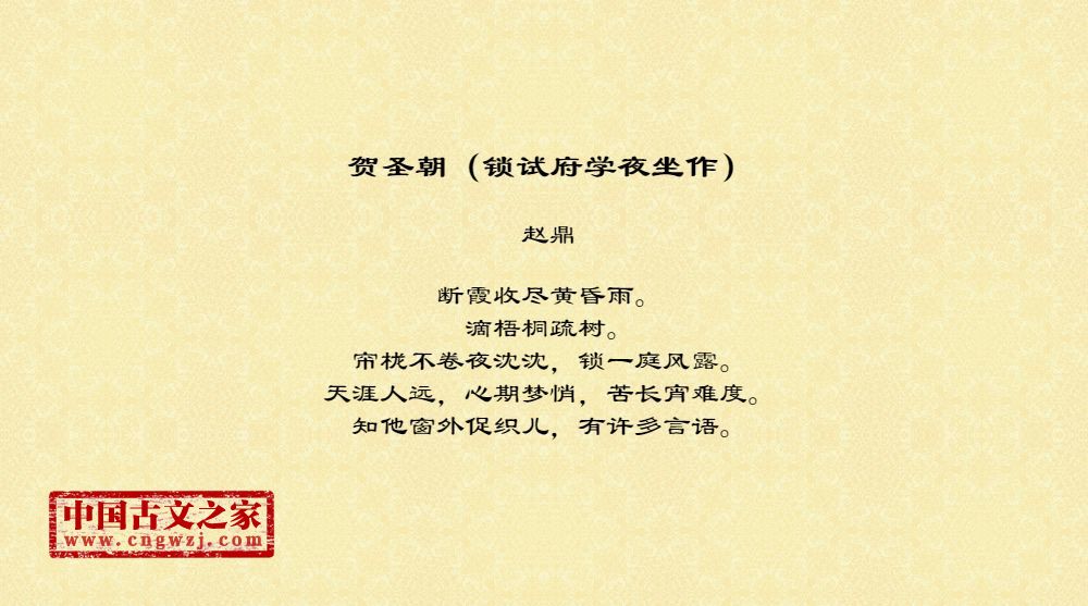 断霞收尽黄昏雨。滴梧桐疏树。帘栊不卷夜沈沈,锁一庭风露。天涯人远,心期梦悄,苦长宵难度。知他窗外促织儿,有许多言语。