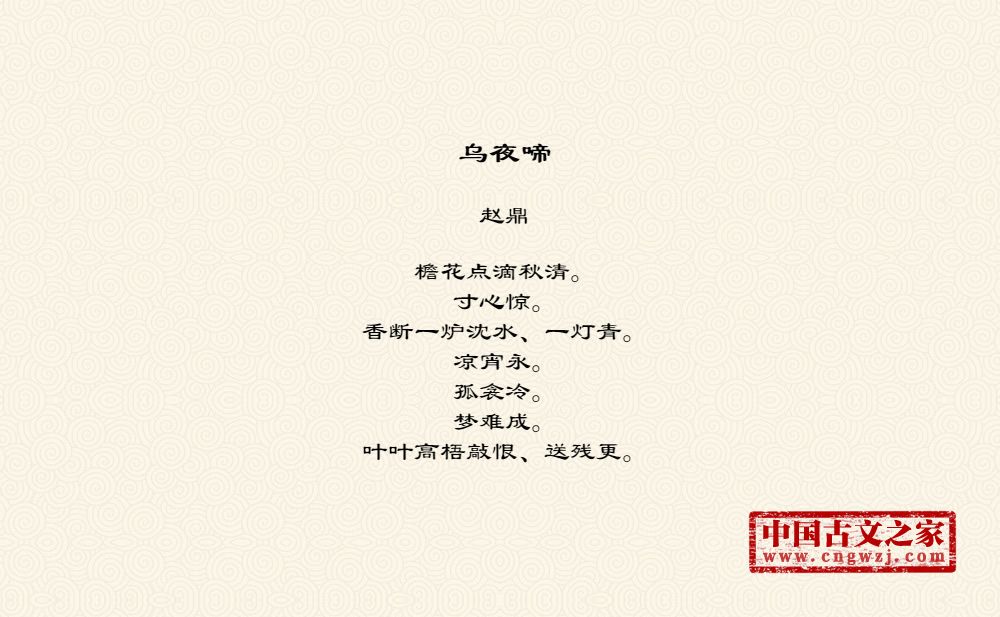 檐花点滴秋清。寸心惊。香断一炉沈水、一灯青。凉宵永。孤衾冷。梦难成。叶叶高梧敲恨、送残更。