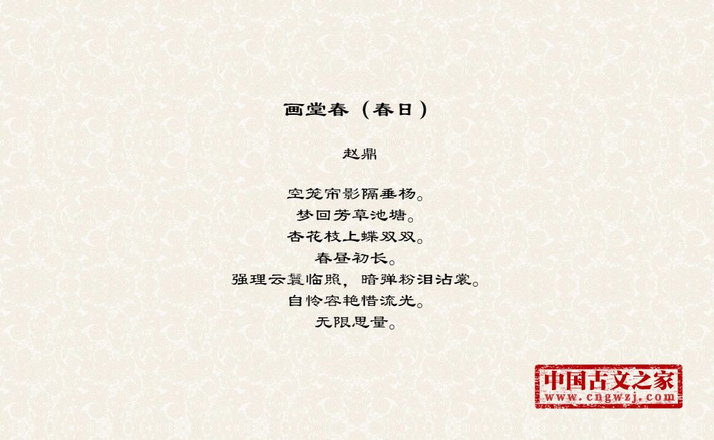 空笼帘影隔垂杨。梦回芳草池塘。杏花枝上蝶双双。春昼初长。强理云鬟临照,暗弹粉泪沾裳。自怜容艳惜流光。无限思量。