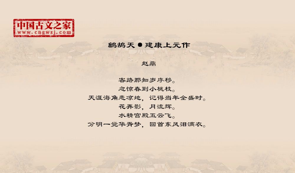 客路那知岁序移。忽惊春到小桃枝。天涯海角悲凉地,记得当年全盛时。花弄影,月流辉。水精宫殿五云飞。分明一觉华胥梦,回首东风泪满衣。