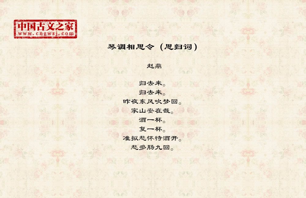 归去来。归去来。昨夜东风吹梦回。家山安在哉。酒一杯。复一杯。准拟愁怀待酒开。愁多肠九回。